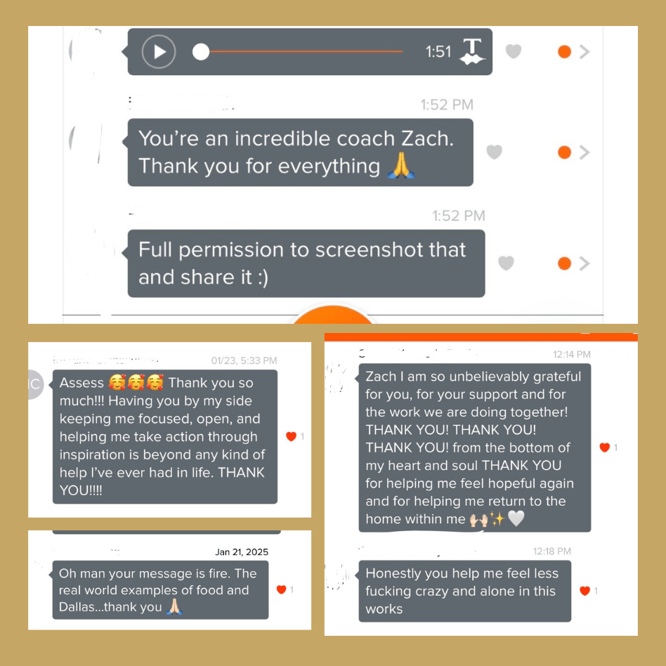"Zach is a rare human. He's the type of man whose depth and listening, connection, and perception are unparalleled by most other men I've met. His ability to ask penetrating questions in a disarming manner is a unique gift in our field. Anyone who finds themself in his care and counsel is fortunate to have him in their corner."